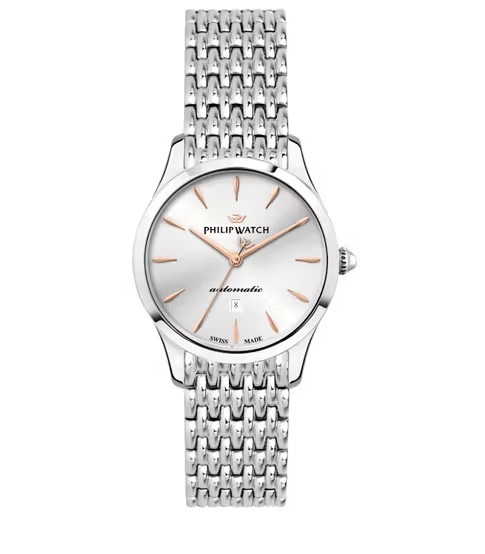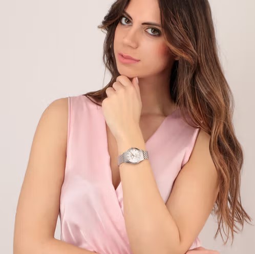 Orologio da donna automatico collezione Grace. Resistenza all’acqua fino a 10 atm. Bracciale in acciaio cassa 32 mm. Quadrante silver con indici rose. Vetro Zaffiro. Swiss Made.