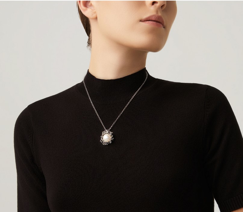 Collana in argento 925/°°° con catena rolò di 45 cm e pendente di 2,5 cm. Ciondolo con perla al centro e classica lavorazione Raspini effetto corallo. Realizzato a mano in Italia. Referenza 10569