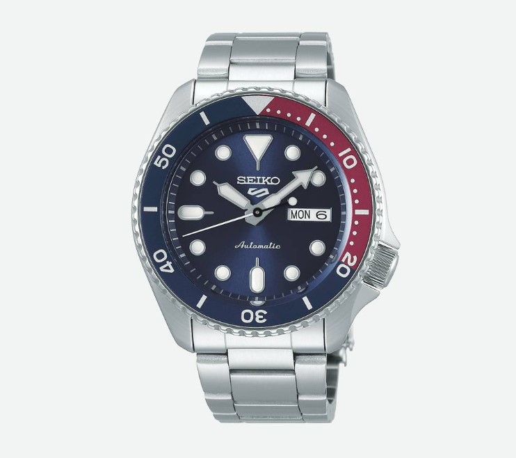 Orologio automatico. 3 H. Subacqueo 10 atm. Cassa 42,5 mm, Quadrante blu ghiera blu e rossa con dettagli bianchi. Bracciale acciaio. Vetro minerale.