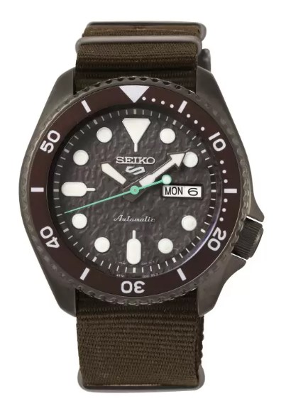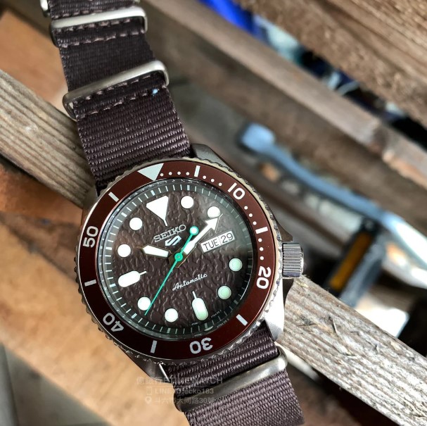 Orologio automatico. 3 H. Subacqueo 10 atm. Cassa 42,5 mm pvd marrone, Quadrante marrone effetto corteccia ghiera marrone con dettagli silver. Cinturino Nato marrone. Vetro minerale.